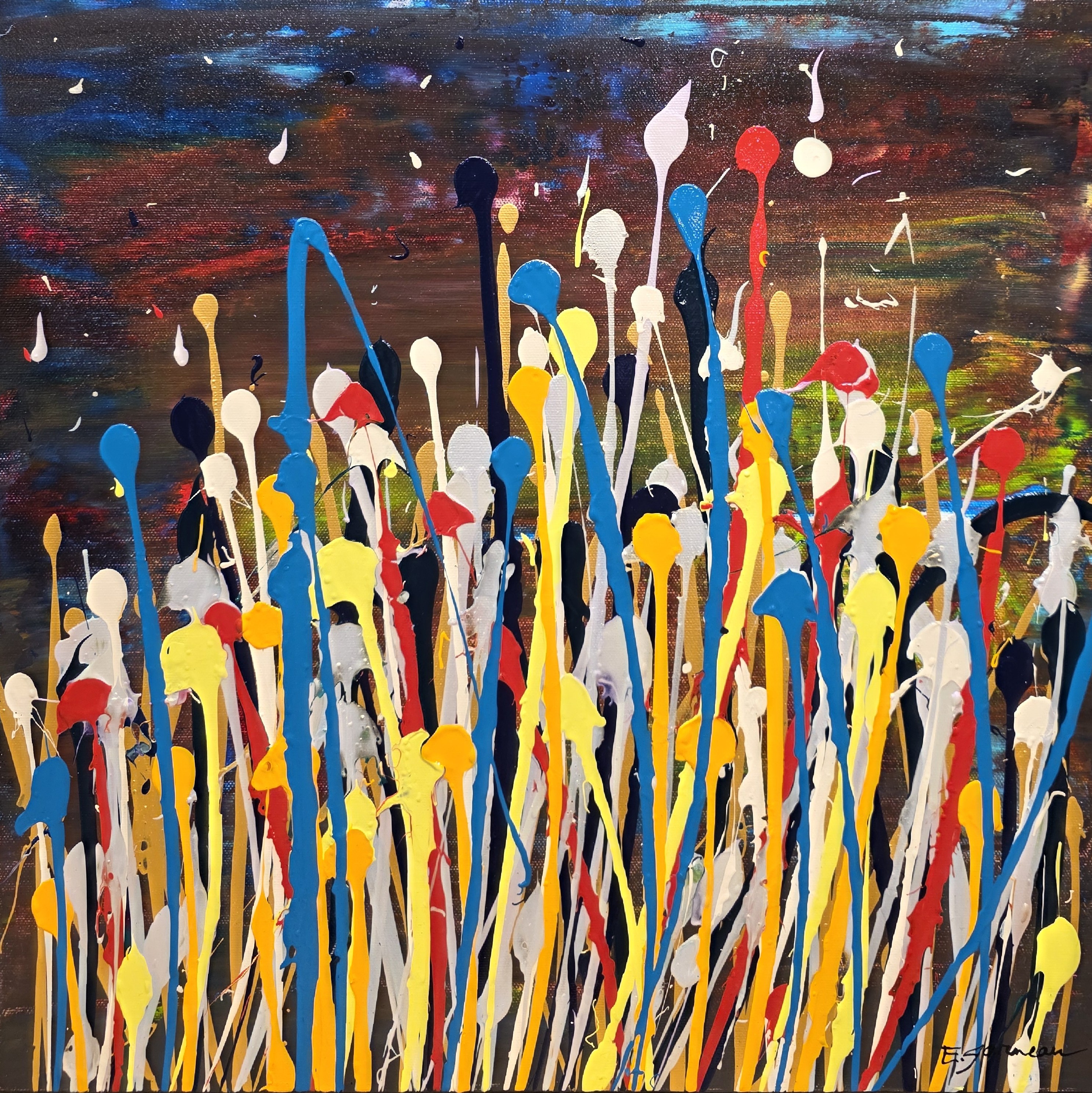 Prendre une fleur à la fois évoque l’importance de ralentir et de savourer chaque instant à travers des élans colorés et spontanés, formant un paysage abstrait vibrant et vivant.